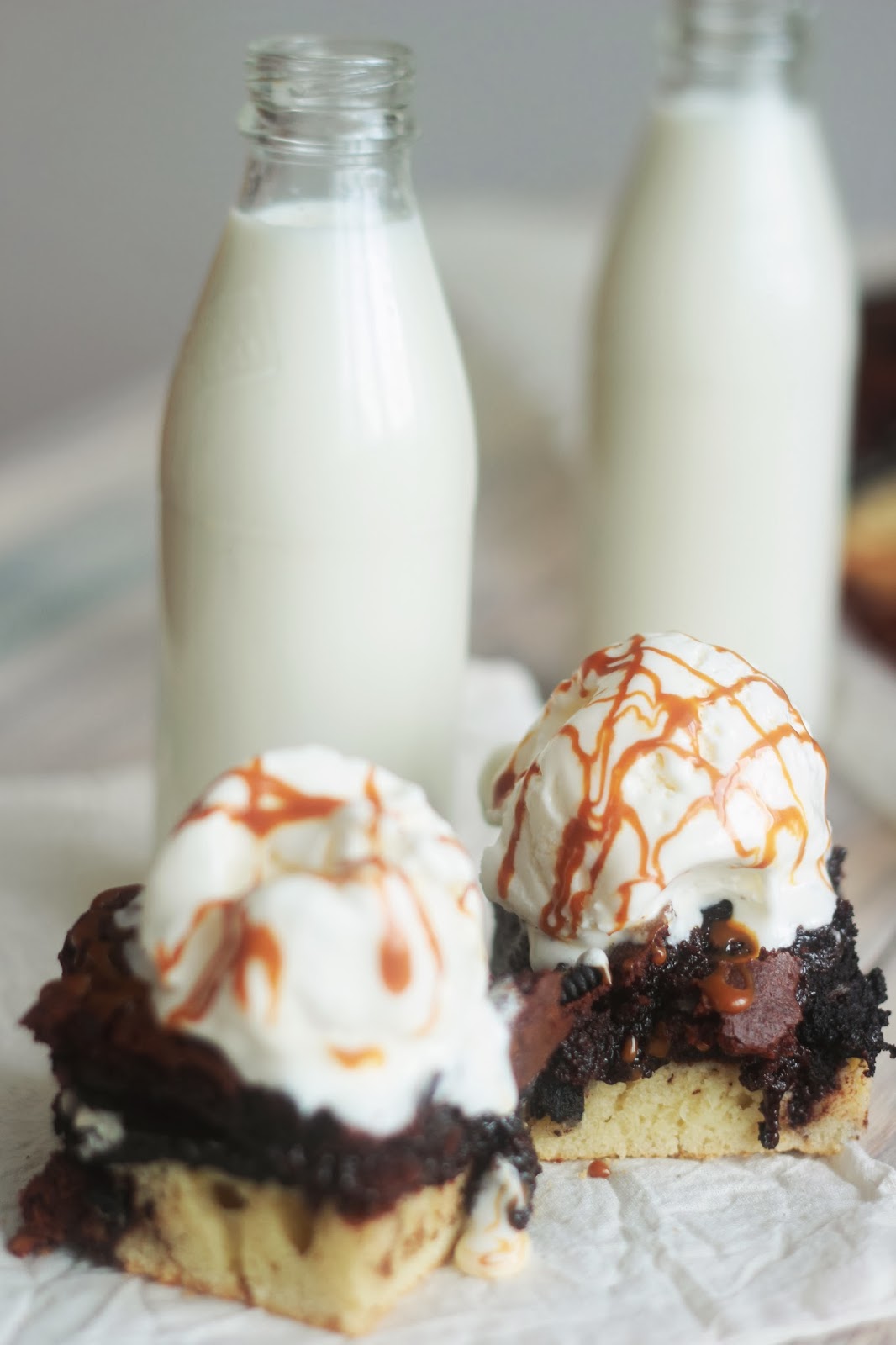 Такой пирог - сендвич достаточно интересен, да и выглядит очень эффектно с шариком мороженого и соусом на праздничном столе, но, к сожалению, только пока горячий. Так что успевайте, пока не остыло ;)